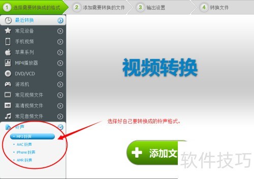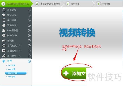 5、 选好铃声格式后,点击添加文件,将待转换的视频文件导入其中。