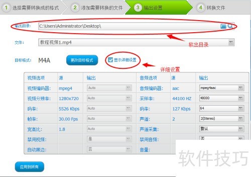 7、 首先设置输出目录,若需查看详细设置,勾选即可。