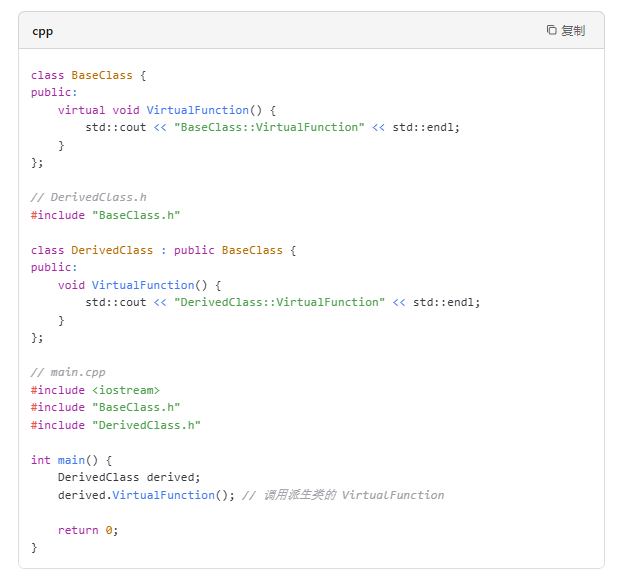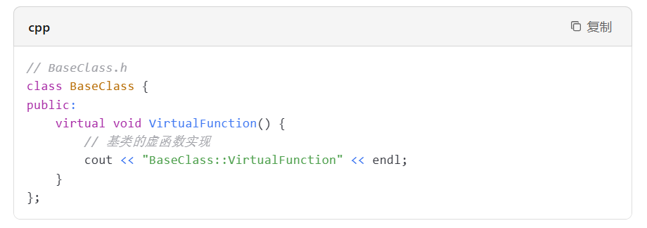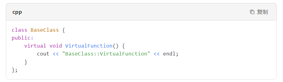 在基类中声明虚函数时,使用 virtual 关键字。例如: