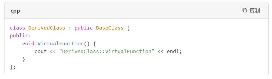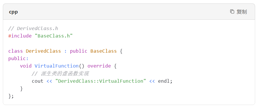 然后,在派生类中重写该虚函数。例如: