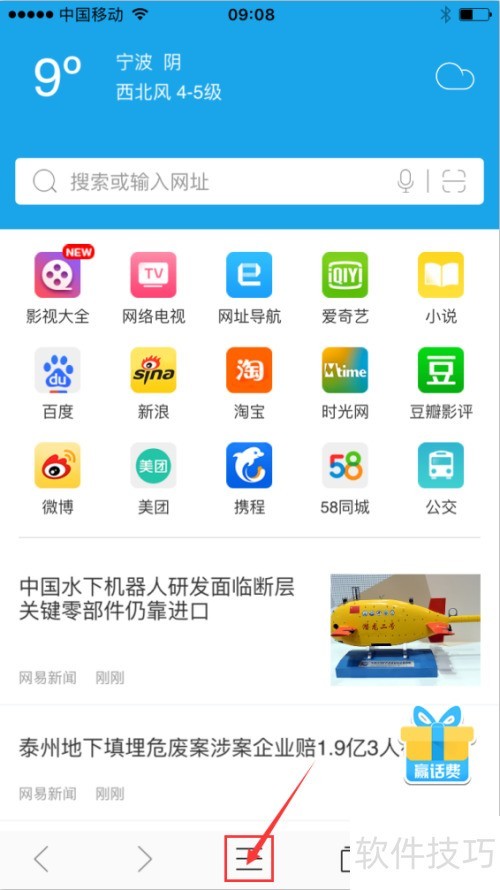 2、 安装千影浏览器后,点击打开。进入页面后,点击下方箭头指向的图标即可。