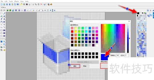 4、 点击右侧颜色面板,颜色对话框弹出,选蓝色后点击添加到自定义颜色按钮,最后点确定按钮使应用生效。