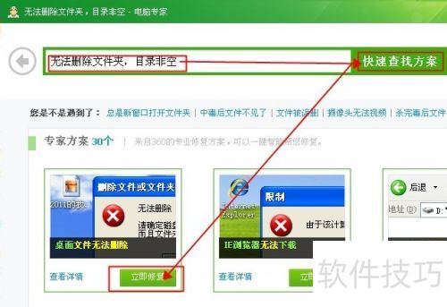 2、 弹出一个界面,在地址栏输入无法删除文件夹,目录非空,点击快速查找方案,出现图2所示界面,点击红框中的立即修复按钮。