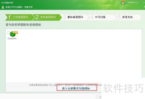 3、 随后,在弹出的界面中,点击进入全屏模式图标,2所示。在图2中勾选要删除的文件夹,点击下一步直至完成。这样操作后,问题即可完全解决。