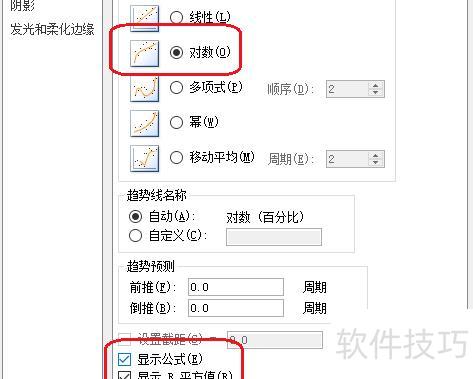 在趋势线选项菜单中选择所需曲线类型,并勾选底部显示公式和显示R平方值前的复选框。