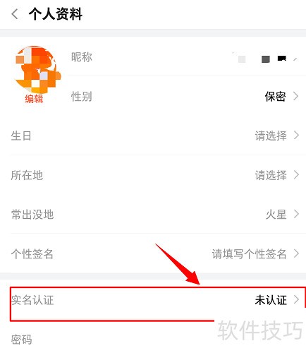 2、 进入个人资料页面,发现尚未实名认证,点击进行认证操作。
