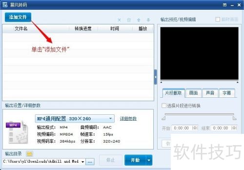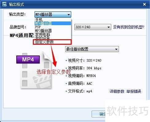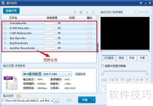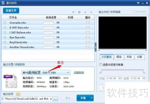 7、 选择好要转换的视频文件后,点击输出配置详细参数中的MP4通用设置 320×240。