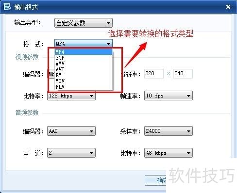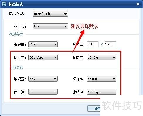 22、 输出格式设置窗口,视频参数有比特率和帧速率,音频参数包括编码率、采样率、声道和比特率。