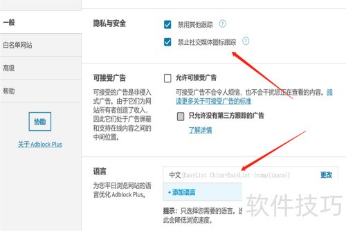 4、 在Adblock配置页,一般设置中可关闭其他跟踪与允许广告,页面底部下拉菜单可设语言。
