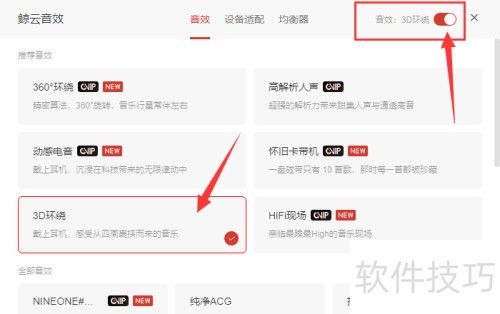 3、 网易云音乐电脑版,开启音效开关,选择喜欢的播放音效,简单两步完成设置。