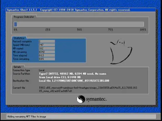 6、进入 Ghost 界面后静候进度条跑完,系统镜像即打包完成。