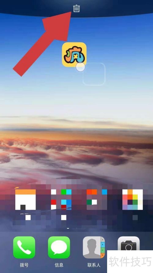 4、 除了在应用管理中删除,还有一种简便方法:在手机桌面找到来疯直播,长按该应用图标,向上拖动至屏幕顶部,出现删除图标时,将应用拖到该处。页面提示卸载后应用数据也会被删除时,点击卸载即可完成操作。