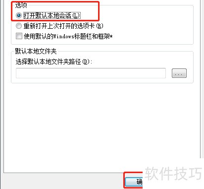 4、 打开默认本地会话,点击左侧圆圈,再点下方确定,完成设置。