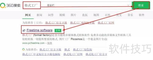 2、 打开网络,搜索格式工厂,找到 freetime software 官网(通常为首个结果),然后打开网站。