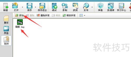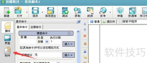 4、 回到按键精灵脚本,左上角找到附件,点击打开,添加刚保存的图片至其中。
