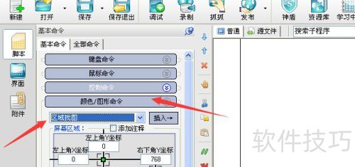 5、 返回脚本代码窗口,选择颜色图形命令,从下拉框选取区域找图。