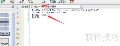 7、 接着点击区域找图旁边的插入按钮,插入一段代码后,打开源代码,在其下添加弹出对话框(MsgBox 找到了),再设置启动与终止键,最后保存并退出。