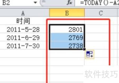 将鼠标置于B2单元格右下角,向下拖动填充公式,即可自动计算下方各时间差的天数。