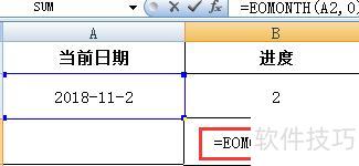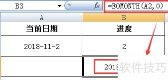提取日期后,需计算该日期所在月份的总天数。为便于查看,可在B3单元格进行操作,输入公式:=EOMonTH(A2,0),即可得出当前日期对应月份的最后一天,从而确定当月天数。