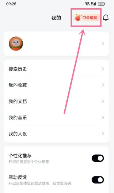 1、打开天工App,点击底部导航栏的“我的”图标,点击右上角【口令福利】。