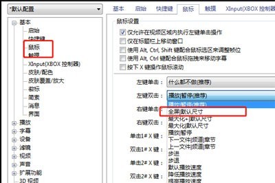 4、启用双击全屏:在【鼠标】设置中,将【左键双击】设为【全屏|默认尺寸】,保存后即可通过双击实现全屏或恢复。