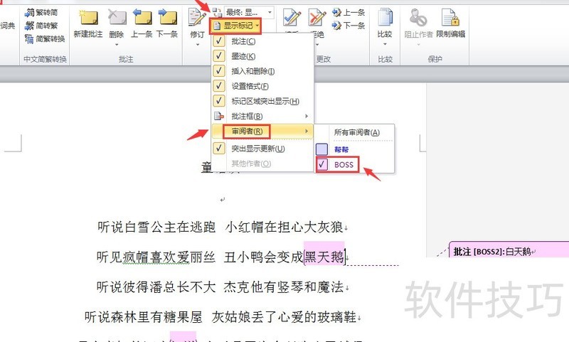 若只想查看某位用户的批注,可在修订栏点击显示标记,选择审阅者,然后勾选对应用户即可。