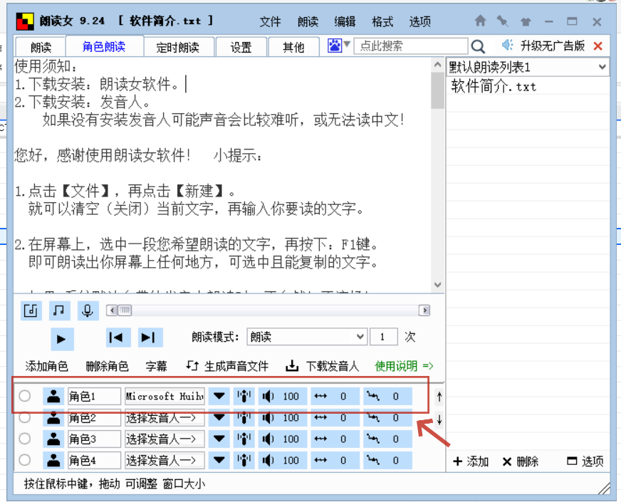 5、设置完成后,角色将会出现选中的发音人,朗读女将朗读声音换成女的啦。