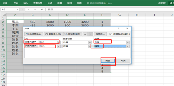 5、设置排序关键字:“主要关键字”选“F列”,选择“升序”;次要关键字选“E列”,点击确定。