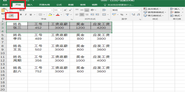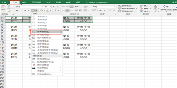 7、添加边框:选中第一个工资信息,点击“开始”选择“全边框”,为第一条工资条加框。