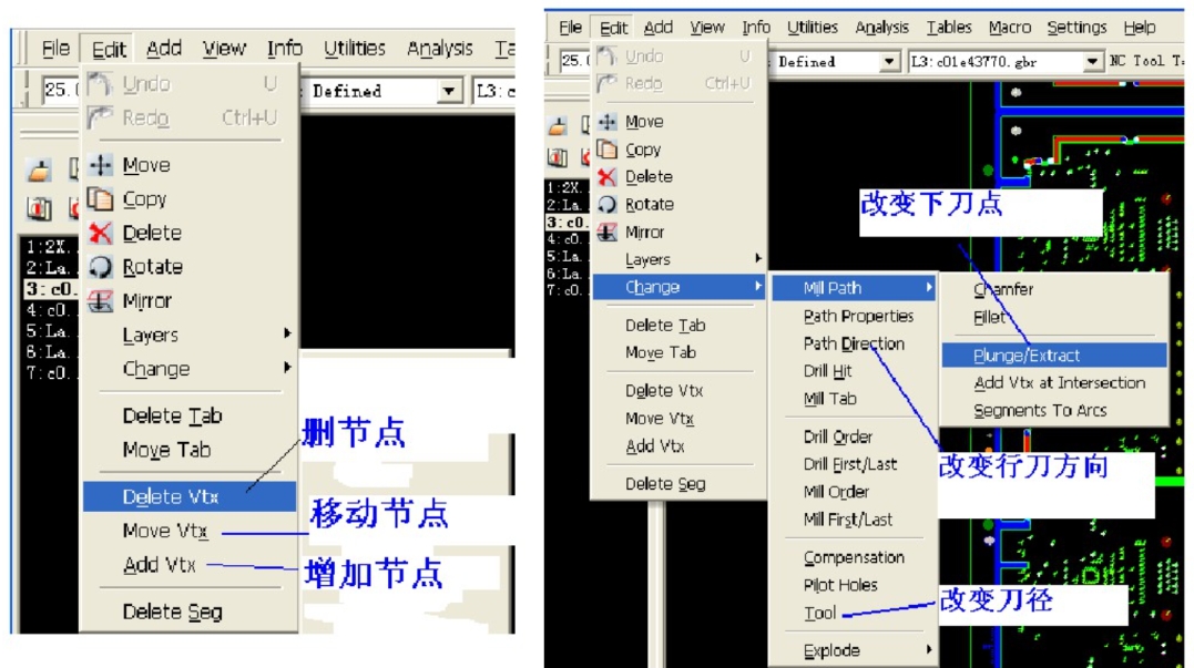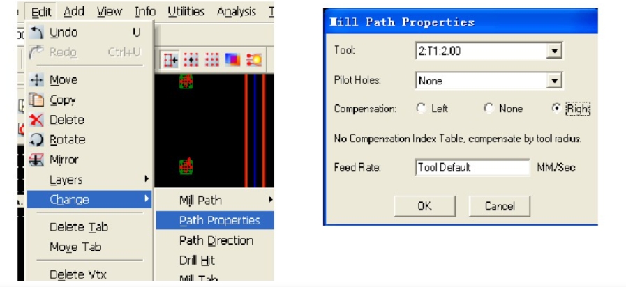 8、锣板,一般先锣内槽再锣外形框;选择锣刀描外形线,需要注意行刀方向可通过右补偿后线中心在板外来判断。