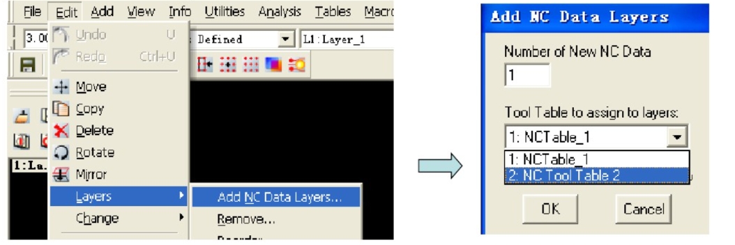 4、建立一个新的NC层(锣带层),并把刚才建立的空钻孔表赋于该NC层。