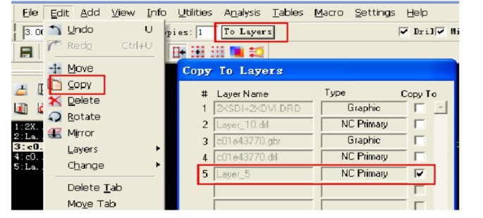 5、选择生产钻带中一个成品内的管位孔(GH1,2,3)COPY至锣带层。