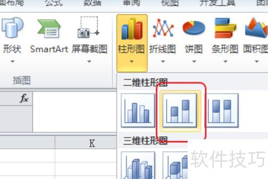 在插入菜单中选择柱形图按钮,可任意选取一种图表样式,其他样式操作方法相同。
