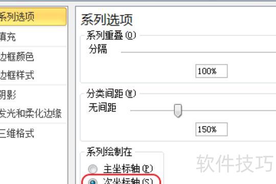 在弹出窗口中选择系列选项,按图示设置为次坐标轴。