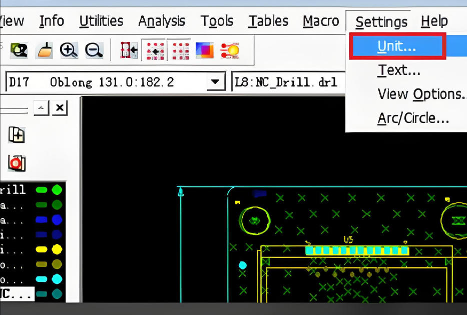 打开CAM350软件,加载元件文件,双击界面中的“Setting”,在弹出的菜单中选择【Unit】选项。