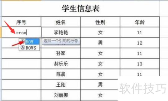 在序列号下方输入=row函数,随后从弹出界面中选取row选项即可。