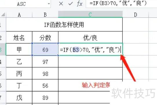 在C3单元格中输入=IF( )公式,用于判断指定条件是否成立,若成立则返回一个值,否则返回另一个值。