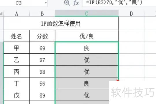 IF函数用于判断条件是否成立,成立时返回指定值,不成立则返回另一值。例如,若分数大于70分返回优,否则返回良,输入公式后按回车即可得到结果。