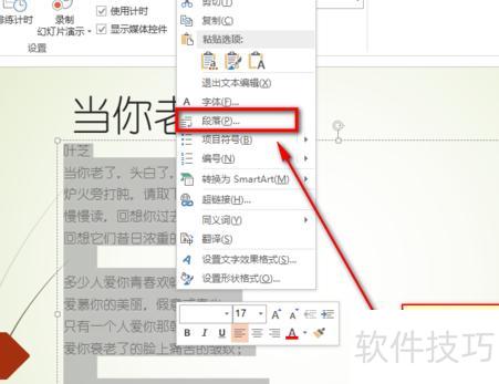 选中文字后右键点击,从菜单中选择段落选项即可。