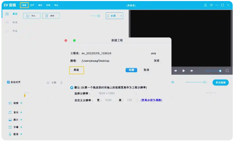 2、点击“新建”按钮,开始创建新的工程文件。在高级设置中,您可以修改文件的名称、选择保存路径,并自定义分辨率以满足您的需求。