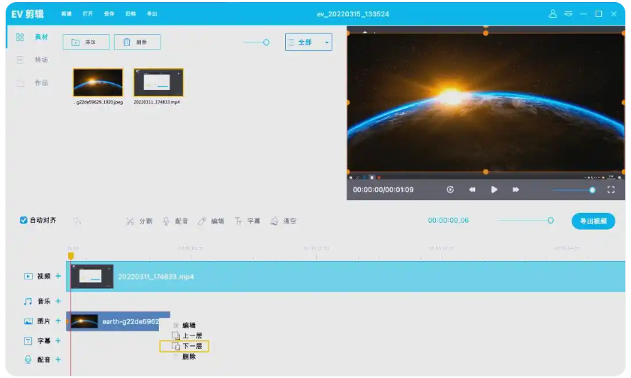 6、接下来,点击“添加”按钮来导入视频,并将其拖拽至下方的编辑轨道上。然后,在预览框中,对背景图片点击右键并选择“下一层”,以便将图片置于底层。最后,根据需要调整视频的大小和位置。