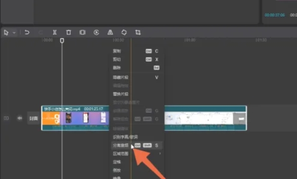 将视频添加到轨道之后,单击鼠标右键,在弹出的菜单中选择【分离音频】选项并点击,此时视频和音频会分离成两个独立轨道。