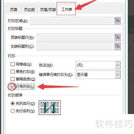 在页面设置窗口中,切换至工作表选项卡,于打印区域勾选行号列标前的复选框,点击确定完成设置。
