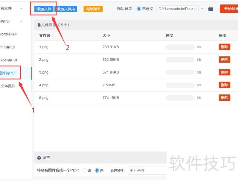 第三步,所示,可选择是否将图片合并为单个PDF文件。若选是,所有图片将被合并在一个PDF中;若选否,每张图片将单独生成一个PDF文件,用户可根据需要自行决定,本次选择否。随后设置输出文件夹,用于保存转换完成的PDF文件。