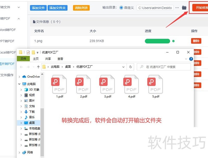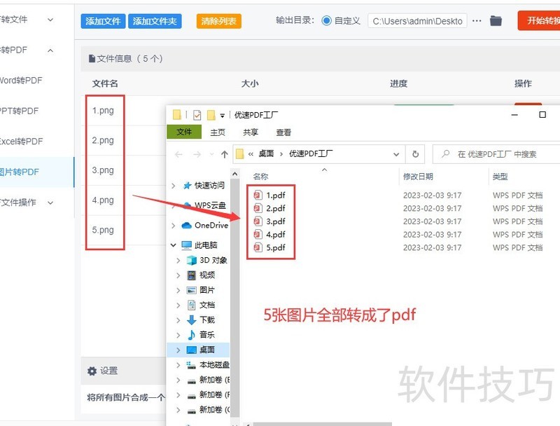 第五步,所示,软件已成功将上传的五张图片逐一转换为五个独立的PDF文件,整个过程快速高效,转换效果清晰理想,操作简便,结果令人满意。