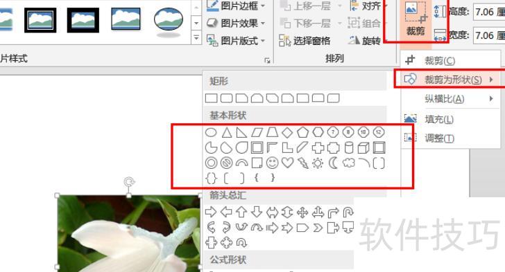 点击下拉菜单,选择裁剪为形状,即可从提供的形状中选取所需样式,将图片裁剪成对应形状。