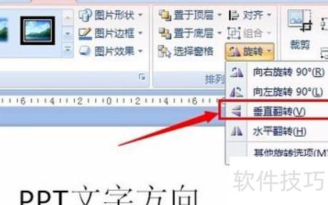 双击插入的图片,上方将显示格式菜单。在选项中找到右侧的旋转功能,点击后于下拉菜单内选择垂直翻转即可完成操作。