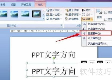 插入图片后,双击选中,系统将自动显示格式标签,点击旋转选项,选择垂直旋转即可完成操作。