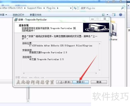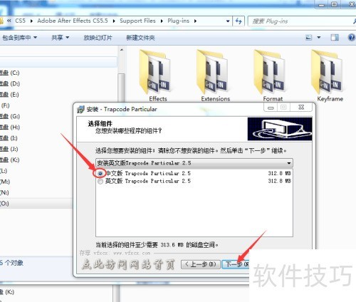 3、 双击Trapcode Particular2.5文件后点击下一步,修改安装路径,前往AE软件根目录下的Plug-ins文件夹,打开并定位到Trapcode文件夹后点确定。若无Trapcode文件夹,则需在首次安装插件时手动创建该文件夹。