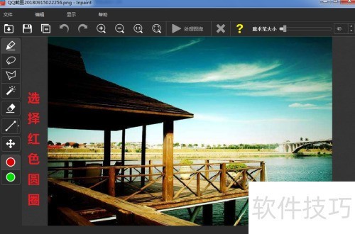 5、 然后我们选中左边工具栏里名为移出区的红色圆点(所示),点击它,再在到此一游四个字上刷一下。